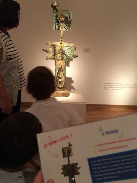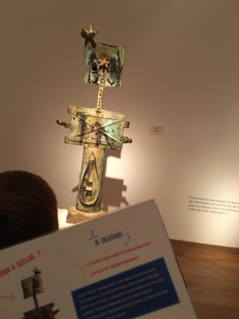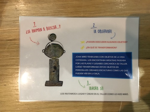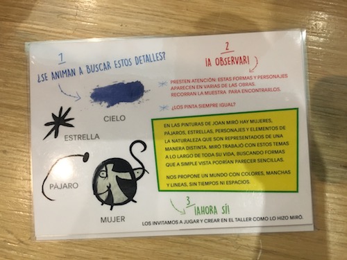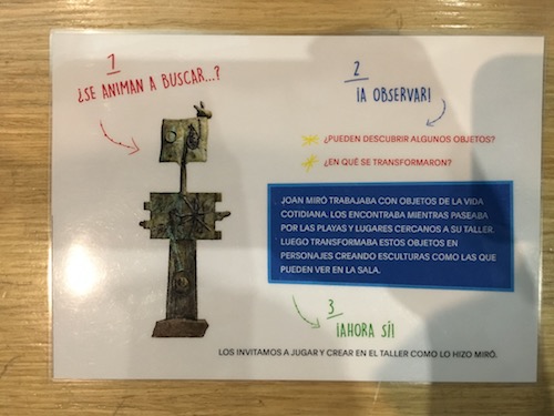 Para los que quieren conocer más sobre nuestra experiencia, les cuento que ayer fuimos con mis hijos y sobrinos, es decir 5 chicos (edades desde el año y medio, cuatro, ocho y diez años) y todos la disfrutaron, cada uno en su comprensión. Llegamos al mediodía para recorrer la muestra por nuestra cuenta y después nos acercamos al Espacio de taller “Mirar para crear” que ofrece dos tipos de actividades. Nosotros aprovechamos “Descubriendo a Miró”” que es un taller abierto y gratuito para familias en torno a actividades sugeridas, para distintas edades a partir de la muestra temporaria de Joan Miró. Éste se encuentra en la misma sala de la exposición, a la izquierda donde también encuentran la tienda y el sector de los toilettes. Fue una gran experiencia para los chicos: sin número (no sé si siempre es así o si según la cantidad de gente van regulandolo) nos acercamos al pasillo donde dos Guías de Taller nos dieron tres fichas por grupo de niños para explorar la muestra y reflexionar en torno a ella. Nos explicó cómo Miró trabajaba los símbolos, que se encuentran descriptos en las paredes del acceso al taller y con ellos salimos a buscarlos entre cuadros y esculturas.