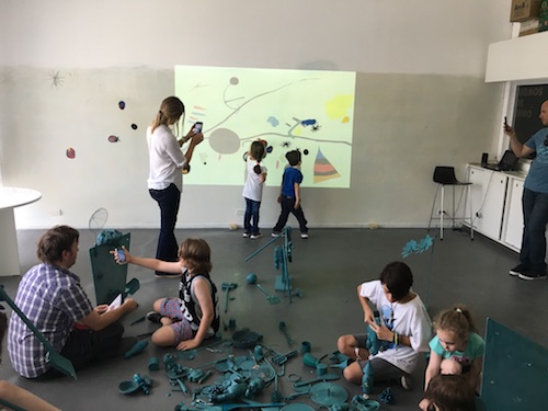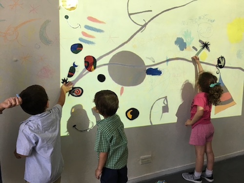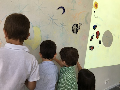 Pasaron luego a una pared en el fondo de la sala, con proyecciones de formas, donde con tizas dibujaron sus propios universos al estilo Miró.