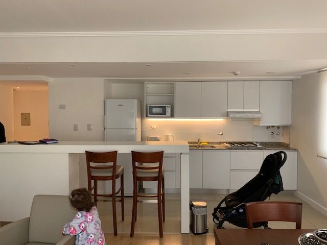 Lo bueno de estar en un apart cuando tenés chicos pequeños, es que tenés todas las comodidades de estar en tu casa: heladera grande, hornallas, microondas más la ayuda de recepción en caso que lo precises y también tiene garage dentro del mismo edificio. Un diez.